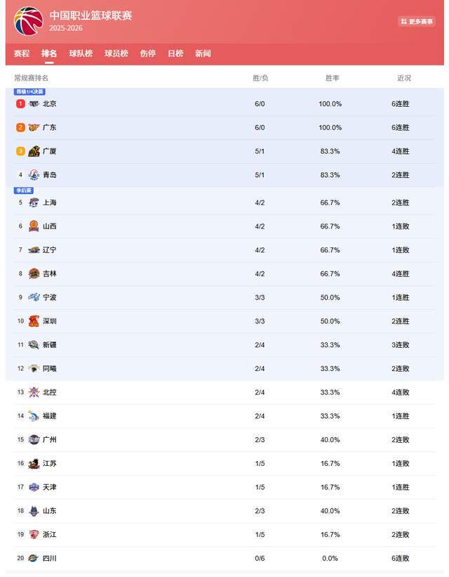 CBA常规赛第六轮结束后,积分榜再次发生变化。北京队和广东队延续强势表现,分别击败新疆队和山东队,豪取6连胜,稳居积分榜前两名。卫冕冠军广厦紧随其后,获得第三名。青岛队本轮爆冷击败山西队,成功进入积分榜前四。滑铁卢面对四届冠军辽宁队,排名跌至第七位。山东男篮倒数第三,令人尴尬。北京队和广东队本赛季表现出色,均以6胜0负的不败战绩领跑积分榜。 B队本轮对阵新疆队。巴加马和卡拉班在帕纳洛的卢班南冈艾兰甘和帕纳洛,以及北京队在马基蒂纳和卡拉班的压力下以89-85,NAnanalo ng anim na magkakasunod na laro。 Sa paghusga mula sa kasalukuyang satwasyon、ang koponan ng 北京和 pinakamalakas at pinaka-matatag na koponan mula noong simula ng bagong 季节。攻防均衡,这是本赛季争冠第一热门。本轮广东队94-88击败山东队,也取得六连胜。不过,相对于北京队来说,广东队的六连胜并不是很重要。除了青岛队实力较强外,其他球队表现都相当一般。接下来面对山西队和北京队,将是他们本赛季真正的考验。青岛队本轮面对强敌山西队。经过四节奋战,青岛队最终以88-81击败对手,成功拿下赛季第五场胜利。青岛队以5胜1负的战绩升至积分榜第四位。这场胜利不仅鼓舞了士气他的球队,也让他们成为本赛季最大的黑马之一。上一轮比赛,辽宁队还在积分榜前四,但本轮过后,辽宁队的排名有所下降。四冠王目前战绩为4胜2负,排在积分榜第7位。这也是他们本赛季开始以来的最差排名。辽宁队的表现让人惊叹,人们也很期待他们在接下来的比赛中的表现。新疆队本轮不敌北京队,战绩为2胜4负,排名积分榜第11位。同曦队爆冷输给天津队后,球队战绩跌至2胜4负,排名积分榜第12位。北控队、福建队、广州队、天津队、江苏队、山东队、浙江队和四川队分列积分榜第13至20位。其中,四川队是唯一一支y 从未赢过的球队。此外,山东男篮的表现也令人失望,2胜3负,排名第18,倒数第三。这是山东高速加大投入后的山东男篮。结果是在邱彪的带领下,实在是出人意料。第七轮比赛将于12月27日至28日进行。本轮的焦点赛事包括主场迎战山东队的齐鲁德比、江苏队对阵江苏队的南京德比、山西队主场迎战广东队、辽宁队客场迎战北控等,也都值得关注。